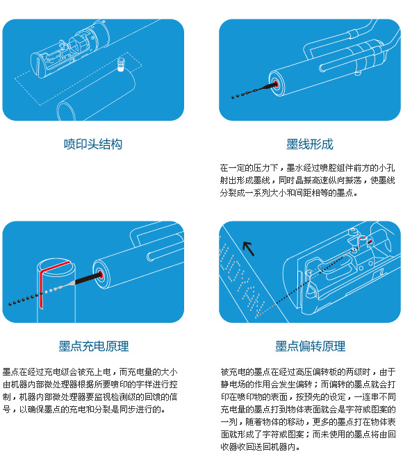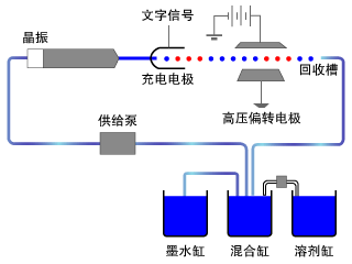 混合缸里的墨水通過供給泵加壓,從噴嘴中噴出柱狀液體。柱狀液體經(jīng)過晶振的振動(dòng),確定墨水粒子的大小。每一個(gè)墨水粒子會(huì)有對應(yīng)的電壓使之帶電,帶電后的墨水粒子在高壓偏轉(zhuǎn)電極之間通過時(shí),根據(jù)其自身的帶電量,確定自己的偏向,到達(dá)噴印物表面。